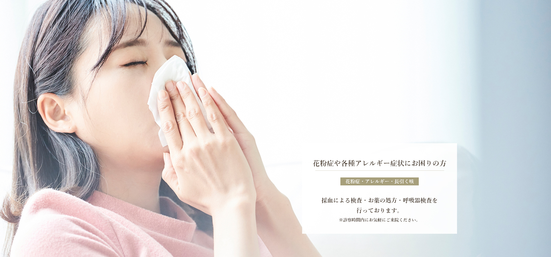 生活習慣病や慢性疾患(呼吸器疾患・循環器疾患・消化器疾患など)はもちろん、感染症やアレルギー疾患、膠原病や内分泌疾患まで幅広く、各種検査を併用して総合的に診療させていただきます。